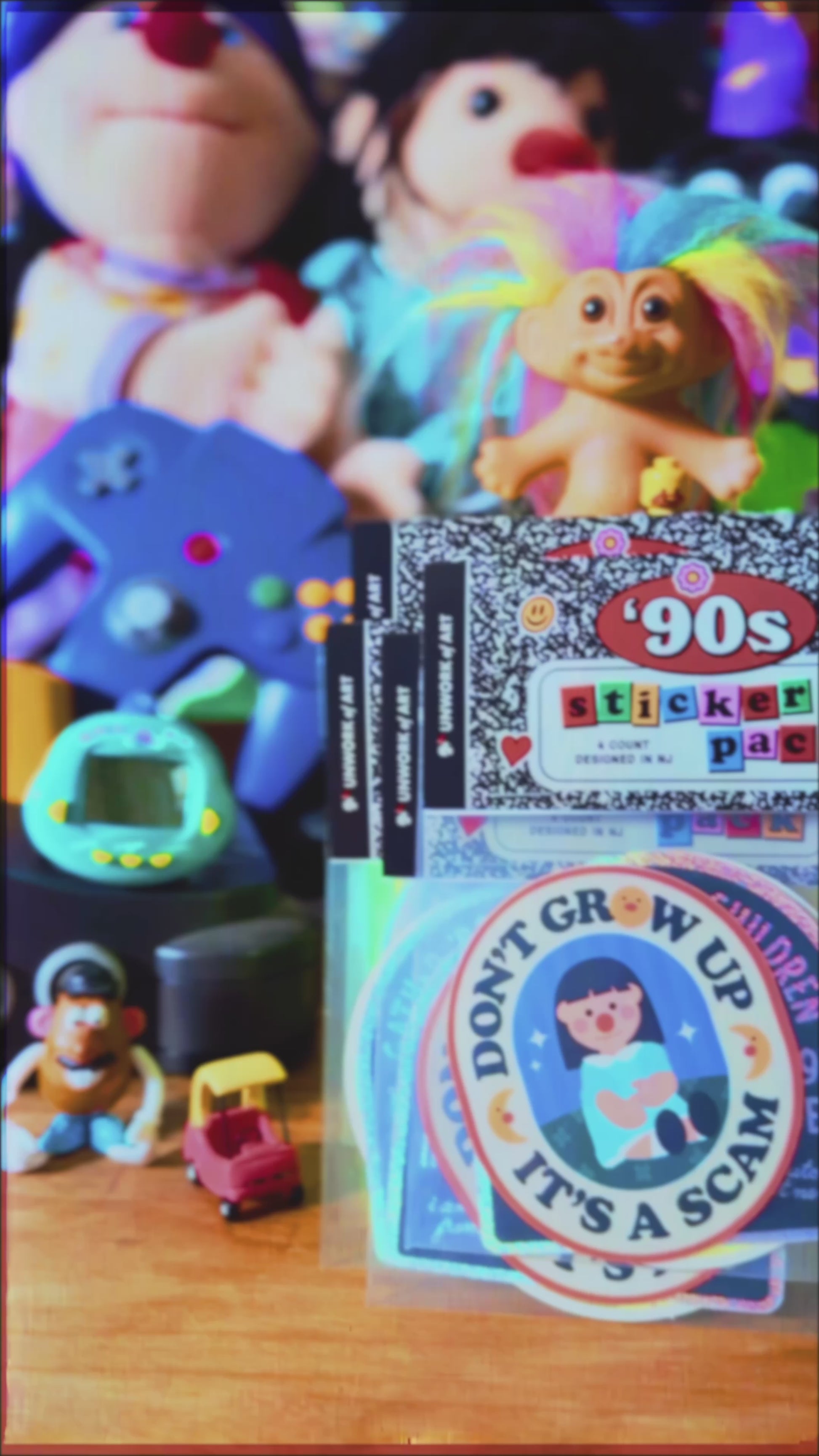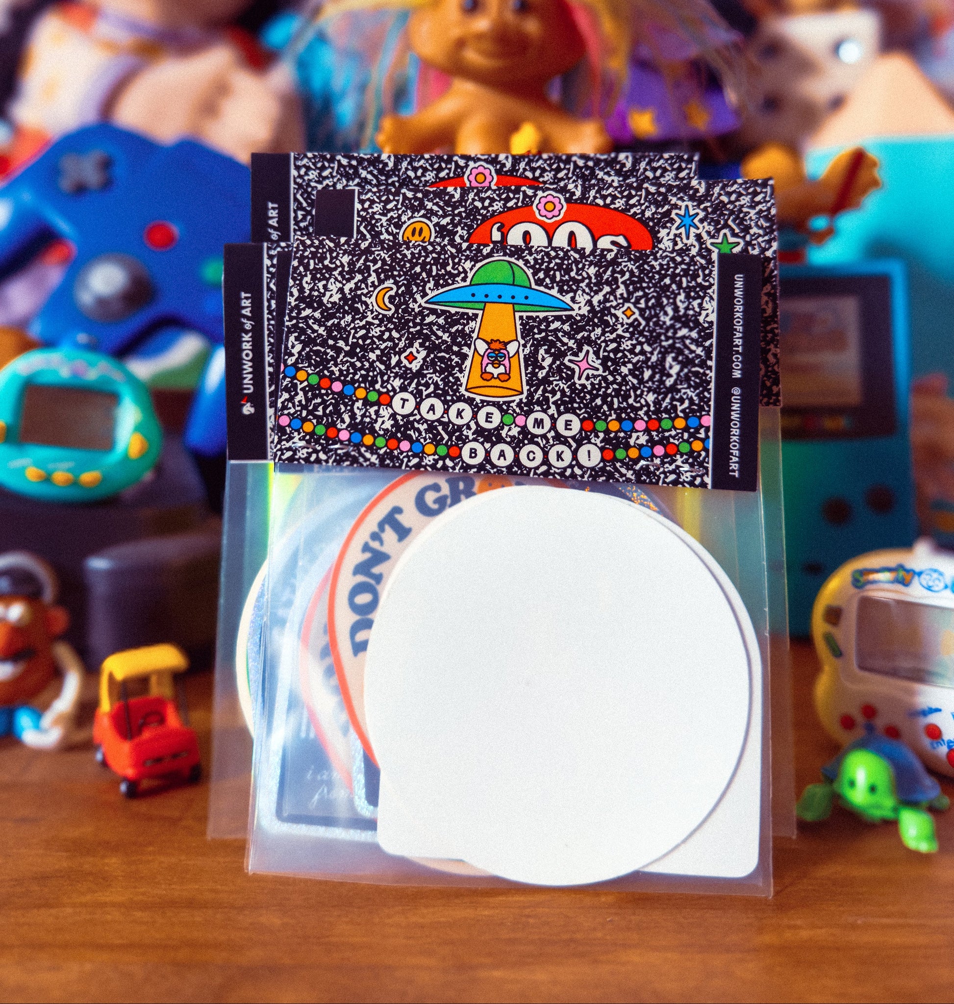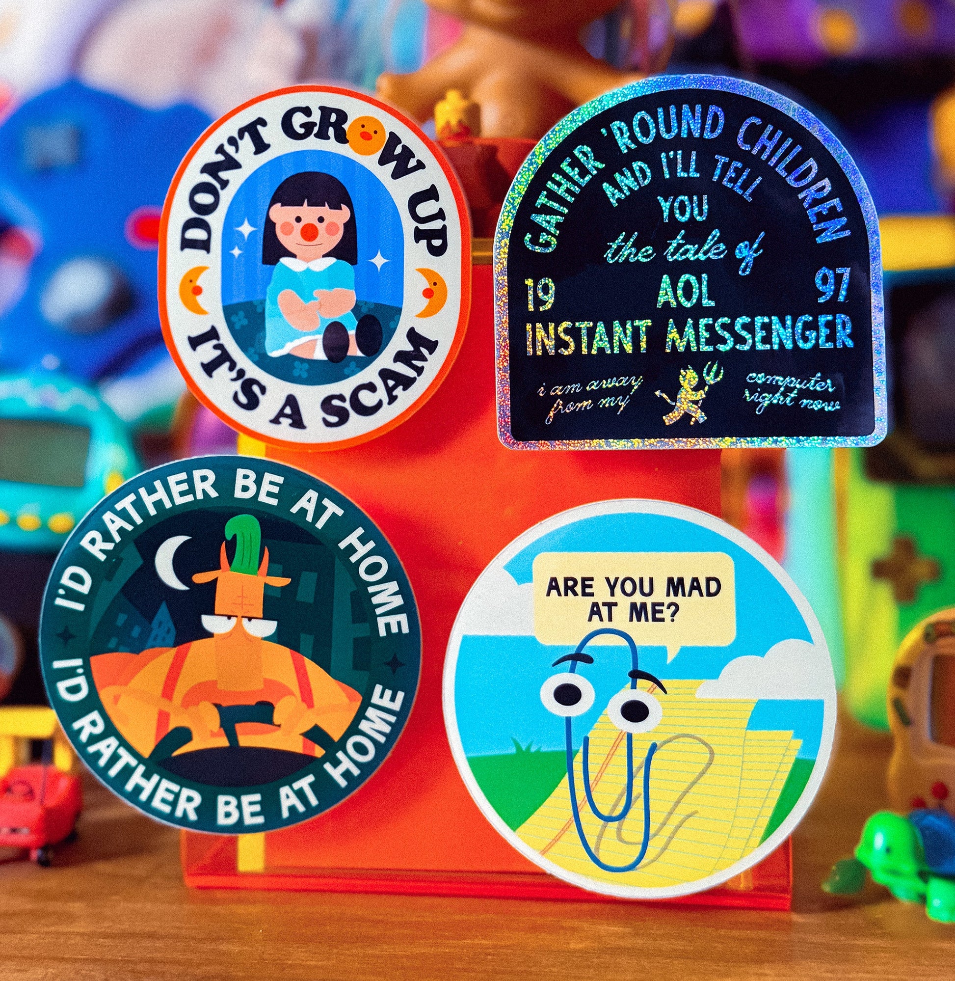 Calling all ‘90s babies who miss the days of signing on to AIM after school. The’ 90s sticker pack contains 4 nostalgic sticker designs, including 1 holographic. All sticker are printed on glossy vinyl and are 3” each. Waterproof and dishwasher safe. Take us back to the ‘90s!